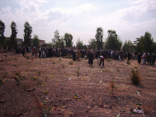 دوستان عزیز امروز جمعه ٦ شهریور ١٣٨٨، برغم تماسهائی که از سوی نیروهای اطلاعات رژیم با ما گرفته شده بود و تهدید هائی مبنی بر خوداری از رفتن به خاوران، ما به سمت گلستان خاوران حر کت کردیم. به دلیل مسدود بودن ورودی خاوران توسط نیروهای لباس شخصی وانتظامی، گلهای سرخ و سپید و به زیبائی نگاه ژرف و گو یا و به عطر عشق جانباختگان را در فضای اطراف گلستان به دست باد سپردیم که با حرکت اتومبیل ها، روی سنگفرش سیاه جاده خاوران می رقصیدند و سیاهی آسفالت را به سرخی متمایل می کردند.