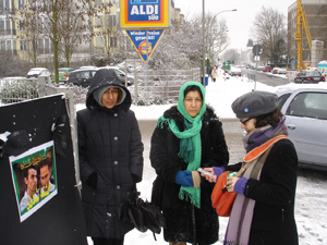از دوشنبه تا جمعه از ساعت ١٠ تا ١٢اینجا می ایستیم با نمایشگاه مان. فرقی هم نمی کند که باران ببارد یا برف و سرما. پلاکارهاهم ثابت نیستند. بسته به حوادث روز، آنها را عوض می کنیم. حالا کارمان جنبه اطلاع رسانی هم پیدا کرده است. مثلا مقاله های جالب را در مورد ایران از روزنامه ها و مجلات آلمانی کپی می کنیم و اینجا نصب می کنیم. این برای رهگذران آلمانی جالب است.»